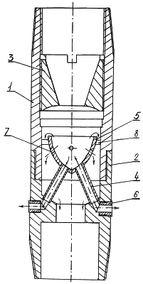Работает устройство следующим образом. Буровой раствор закачивается через колонну труб, поступает в полый корпус 1, проходит через сужающую полость диффузора 3, разгоняется и, приобретая определенную скорость, улавливается суженой частью полой ловушки 5.