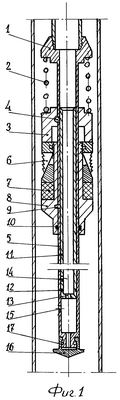 Пакер-мост спускают в скважину на насосно-компрессорных или бурильных трубах и устанавливают выше интервала перфорации. Скважину промывают и закачивают цементный раствор до равновесия через циркуляционное отверстие 15. Затем бросают запорный шар, который перекрывает отверстие в седле 13, и создают в колонне труб избыточное давление, в результате чего втулка 11 перемещается вниз. При этом совмещаются циркуляционные отверстия 14, 15 и размыкается замок пускового устройства, после чего пружина выдвигает плашки 6 до упора в эксплуатационную колонну. При натяжении колонны труб, соединенной с фланцем 1 пускового устройства, срезаются соединительные штифты 9 и запакеровывается уплотнительный элемент 7. Таким образом, верхняя часть эксплуатационной колонны оказывается гидравлически разъединенной с подпакерной зоной. После этого производят задавливание цементного раствора в заколонное пространство через совмещенные циркуляционные отверстия 14 и 15. По окончании задавки колонну поднимают, не снижая в ней давления. При этом корпус пускового устройства 5 выходит из корпуса пакера 8 без снижения давления в подпакерной зоне благодаря уплотнению 10 и запирает проходное сечение корпуса пакера 8 заглушкой 16, которая отсоединяется от него пружинным кольцом 17. В результате в подпакерной зоне остается давление задавки, при котором цементный раствор затвердевает, а через отверстия 14, 15 в корпусе пускового устройства осуществляется вымыв излишков цементного раствора из надпакерной зоны, после чего, не ожидая затвердевания цементного раствора, пусковое устройство поднимают на поверхность.