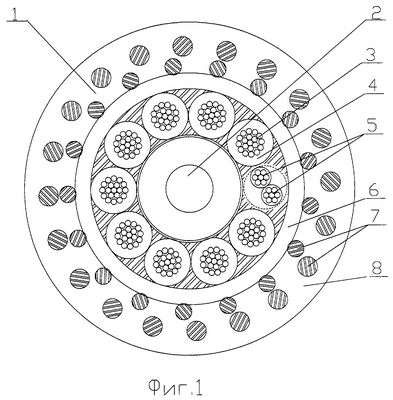 На фиг.1 представлена одна из возможных конструкций нагревательного кабеля 1, содержащего один металлический или пластмассовый гидравлический канал 2, нагревательные элементы 3 в полимерной изоляции 4, сигнальные проводники 5, заключенные в общую оболочку 6 и имеющего внешнюю грузонесущую двухповивную броню из стальных проволок 7 с заполнением промежутков между проволоками полимерным составом 8.