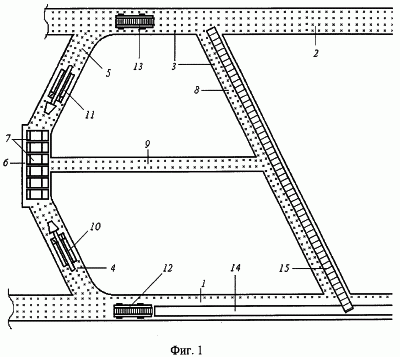 Для механизации работ в выемочном участке используют проходческие комбайны с исполнительным органом избирательного действия или очистные комбайны фронтального действия 10 (в заходке 4) и 11 (в заходке 5), самоходные вагоны 12 (в конвейерном штреке и заходке 4) и 13 (в вентиляционном штреке и заходке 5), телескопический ленточный конвейер 14, установленный в конвейерном штреке 1, и скребковый конвейер 15, установленный в диагональной сбойке 8.