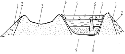 При строительстве кустовых площадок производится отсыпка 3 минеральным грунтом, в объеме которой устраивается земляной амбар А, стенки которого гидроизолируются с помощью полиэтиленовой пленки 4. После завершения кустового строительства приступают к рекультивации амбара, заполненного отработанным буровым раствором (ОБР). Первоначально в объеме земляного амбара устраивается перегородка 6 из смеси песка и глины, которая имеет гидроизолирующие свойства. Данная перегородка 6 разделяет земляной амбар А на два отсека: отсек Б и отсек В. Затем из отсека В с помощью насоса жидкую фазу ОБР 7 перекачивают в отсек Б, а твердую фазу ОБР 8 из отсека В перемещают экскаватором в отсек Б. После отстаивания и разделения жидкой фазы ОБР 5 и твердой фазы ОБР 9 в отсеке Б всю жидкую фазу ОБР перекачивают в осек В с помощью насоса. Таким образом, в отсеке Б остается только твердая фаза ОБР, а в отсеке В только жидкая фаз ОБР. Жидкая фаза в отсеке В подвергается очистке, например, с помощью коагулянта – сернокислого алюминия. В отсек Б завозят песок и торф, которые перемешивают с ОБР. Перемешивание может производиться экскаваторами или бульдозерами. Полученную смесь 1 перемещают из отсека Б на откосы кустовой отсыпки 2, выравнивают и засевают травой, для полива травы используется вода из очищенной жидкой фазы ОБР из отсека В. Освобожденная от буровых отходов и жидкой фазы емкость земляного амбара А с течением времени заполняется дождевой и талой водой и превращается в элемент ландшафта, который способен разнообразить природную экосистему.