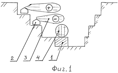 Сущность способа поясняется схемой: на фиг.1 – для случая открытого карьера, на фиг.2 – для подземной выработки. При массовом взрыве в блоке (1) в районе этого блока до взрыва оросительными установками /2/ создается завеса из тонкораспыленной ионизированной жидкости (3), которая способствует коагуляции частиц из пылегазового облака (4) и их интенсивному выпадению на подстилающую поверхность. Продолжительность работы установок (2) определяется временем значимого пылевыделения в блоке (1).