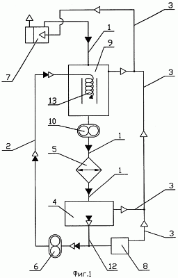 Возможен вариант, когда масло из центробежного суфлера 7 подается в маслобак 9 дополнительным откачивающим насосом 11 (см. фиг.2). В этом случае возможен захват насосом 11 из центробежного суфлера 7 одновременно с маслом незначительного количество воздуха, тогда масло в смеси с незначительным количеством воздуха по магистрали 2 откачки подается в центробежный воздухоотделитель 13 маслобака 9. В центробежном воздухоотделителе 13 масло, отделяясь от воздуха, стекает в маслобак, а воздух через отверстие (не показано) воздухоотделителя 13 выходит в верхнюю часть маслобака и отводится в центробежный суфлер 7.
