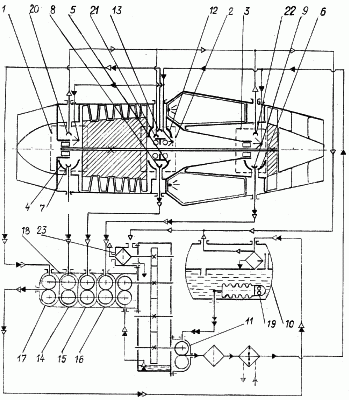 При нормальном полете самолета масло из маслобака 10 через инерционный маслозаборник 19 забирается нагнетающим насосом 11 и под давлением подается к форсункам подачи масла масляных полостей 1, 2 и 3. Отработанное масло стекает вниз в маслосборники 4, 5 и 6, откуда забирается маслозаборниками 7, 8 и 9 и передается в блок откачивающих насосов 18, который сбрасывает масло внутрь маслобака 10. Суфлирование масляных полостей подшипниковых опор ротора осуществляется с помощью суфлирующих заборников 20, 21 и 22, которые воздушно-масляную смесь транспортируют на вход центробежного суфлера 23; при этом масляная полость 2 будет дополнительно суфлироваться с помощью маслозаборника 13, который воздушно-масляную смесь транспортирует к центробежному суфлеру 23 более длинным путем – через блок откачивающих насосов 18 и маслобак 10. При перевернутом полете самолета или полете с отрицательными перегрузками находящееся в масляных полостях 1, 2 и 3 масло под действием силы тяжести уйдет из маслосборников 4, 5 и 6 в верхнюю часть полостей, при этом масло из маслосборника 5 попадет в маслосборник 12; масло, находящееся в маслобаке 10, вместе с инерционным маслозаборником 19 также переместится в верхнюю его часть. Подача масла в масляные полости 1, 2 и 3 подшипниковых опор ротора будет продолжаться и в этих условиях, так как расходуемый из маслобака 10 объем масла будет частично восполняться возвратом той его части, которая поступает в масляную полость 2, а это около 50% всего расхода масла в ГТД.