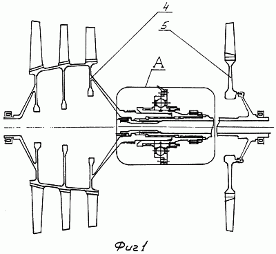 на фиг.2 – промежуточный соединительный вал со шлицевыми хвостовиками роторов компрессора и турбины (элемент А фиг.1).