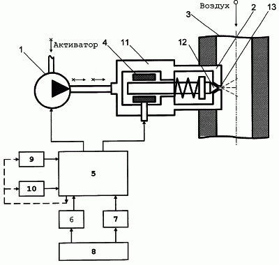 В зависимости от нагрузочно-скоростного режима работы дизеля информативные сигналы от датчика 9 частоты вращения коленчатого вала и датчика 10 положения рейки топливного насоса высокого давления поступают в электронный блок управления 5, который формирует командный импульсный сигнал (нулевой или единичный) и посылает его в электромагнит 4 распылителя 2. При подаче нулевого импульсного сигнала с электронного блока управления 5 в цепь электромагнита 4 распылителя 2 обмотка его обесточится, игла 12 перекроет канал 12 распылителя 2 и подача активатора прекратится. При подаче единичного импульсного сигнала в цепь распылителя 2 игла 11 откроет его канал 13 и подача активатора возобновится.