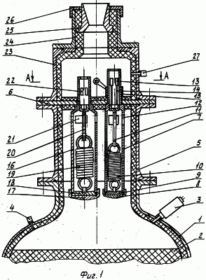 К промежуточной проставке с пластиной пристыкована предсопловая теплоизолированная проставка 23, корпус соплового блока 24 с сопловым вкладышем 25 и фиксирующей гайкой 26. Проставка 23 с сопловым блоком 24 и пластиной 6 образуют ресиверную камеру, в которой установлен датчик давления 27.