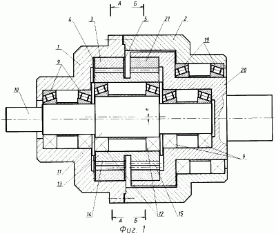 Во второй части корпуса 2 с опорой на подшипники 19, соосно оси вращения ведущего вала 10, установлен ведомый вал 20, на котором неподвижно закреплено второе солнечное колесо 21, установленное соосно продольной оси первого солнечного колеса 3.