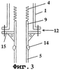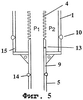 На фиг.3, 4 и 5 показаны альтернативные соединения между транспортирующим трубопроводом 5, вертикальным трубопроводом 1 и гибкой внутренней трубой 4. Надлежащим образом используется промежуточное соединение труб 9 между транспортирующим трубопроводом 5 и гибкой трубой 4. Целесообразно, чтобы оно было соединено с соответствующими трубопроводами посредством сварки. Соединение труб 9 плотно закреплено в торцевом участке 15, который, в свою очередь, может быть соединен с вертикальным трубопроводом 1 посредством сварного соединения 10, как показано на фиг.5, зажимной соединительной муфтой 11, как показано на фиг.4, или фланцевым соединением, как показано на фиг.3.
