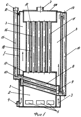 При этом дополнительный теплообменник 11 может быть выполнен трубчатым, например в виде вертикальных трубок 16, закрепленных по концам в трубных досках 17. Причем межтрубное пространство 18 соединено с водяной рубашкой 3, а полости 19 трубок 16 – с полостью топочной камеры 2.