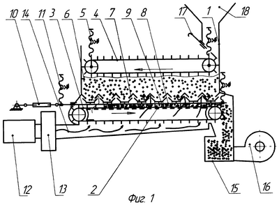 Механизм возвратно-поступательного движения каретки 10 переводят в положение сушки, затем открывают заслонку регулировки подачи материала 17 и материал цепочно-скребковым разравнивающим транспортером 4 заполняется в камере 1 заданной толщиной. После загрузки камеры 1 датчик уровня материала сушки 6 отключает привод на цепочно-скребковый разравнивающий транспортер 4. С помощью топочного блока 12 и вентилятора 13 начинается подача теплоносителя по каналу 14 в камеру 1. Происходит нагревание материала и транспортирование испарившейся влаги.