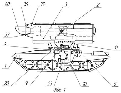 Управление установкой осуществляется командиром-оператором с его рабочего места 23 из кабины 24, съемно закрепленной на кольцевой опоре 7 поворотной платформы 4 и размещенной во внутреннем забронированном объеме корпуса шасси 1.