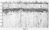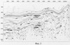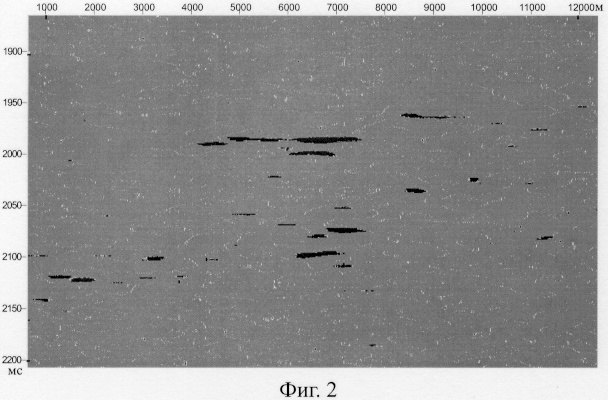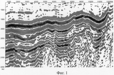 На фиг.1 приведен фрагмент исходного широкополосного динамического временного разреза по профилю 2D-сейсморазведки в зоне известной по данным бурения границы залежи нефти. На фиг.2 показано изображение плоских субгоризонтальных границ, оставшихся в пространстве временного разреза после ослабления всех других волн и подбора оптимального усиления записи по предлагаемому способу.