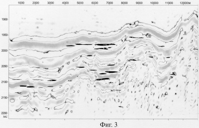 Таким образом, предлагаемый способ благодаря нелинейным методам глубокого подавления некогерентного шума и всех волн, связанных с негоризонтальными границами, выполняемыми в высокочастотном диапазоне, позволяет в рамках существующих комплексов обработки данных сейсморазведки на ЭВМ создать лишенную субъективизма технологию, надежно выделять и картировать локальные субгоризонтальные границы, связанные с ВНК и ГЖК, а также палеоВНК, оконтуривать залежи углеводородов, выявлять возможные каналы их миграции и осуществлять мониторинг развития залежей.