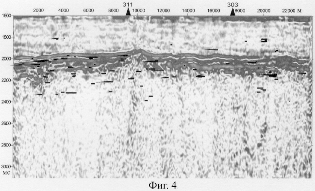 На фиг.4 приведен временной разрез мгновенных амплитуд с вынесенными на него субгоризонтальными площадками, выявленными по предлагаемому способу. Области сгущения этих площадок (современных и палеоВНК) в сочетании с блоковой структурой разреза позволяют прогнозировать возможные каналы миграции углеводородов и высокопродуктивные участки залежей вблизи этих каналов. Так пробуренная здесь скв.311, в зоне которой отмечается сгущение отражающих площадок от ВНК, при испытаниях пласта ЮК1, к которому и приурочены указанные площадки, дала приток нефти 74 м3/сут, а скв.303, в районе которой отмечается единичная не очень интенсивная отражающая площадка, при испытании открытым стволом всего юрского разреза, включая зону контакта с палеозойским комплексом, дала всего 0,43 м3/сут. Выявленные на данном профиле (в районе пикетов 2000 и 20000) зоны тектонических нарушений отличаются сгущением отражающих площадок, полученных по предлагаемому способу, и поэтому их можно рассматривать в качестве прогнозируемых залежей углеводородов повышенной продуктивности благодаря формированию здесь улучшенных коллекторов трещинного типа. Однако участок на пикете 20000 представляеся менее перспективным, поскольку отсутствие здесь надежной покрышки в виде глинистого пласта в кровле юрского комплекса, который четко отмечается на времени 2000 мс по другим участкам профиля, создавало неблагоприятные условия для сохранения залежи. Подтверждением возможной миграции углеводородов вверх по разрезу является наличие здесь отражающих площадок, связанных с ВНК, в вышележащей нижнемеловой части разреза (на времени 1800 мс).