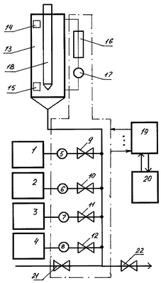 Перед началом цикла калибровки емкости 1-4 заполняют водными растворами хлористого натрия возрастающей концентрации, УЭС которых известно из специальных таблиц и измеряется эталонным кондуктометром 16. Калибруемый скважинный резистивиметр 18 помещают в рабочую камеру 13 и подключают входы/выходы скважинного резистивиметра 18 к блоку сопряжения 19, соединенному с компьютером 20.