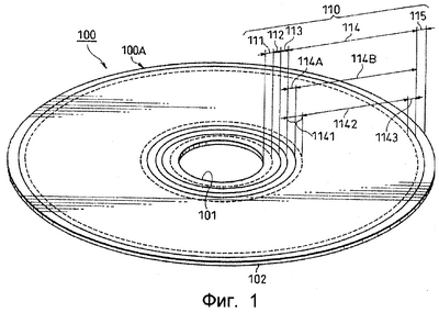 На одной поверхности корпуса 100А подложки образована кольцевая поверхность записи. Эта поверхность записи имеет внутреннюю зону 111, имеющую кольцевую форму, зажимную зону 112, которая является зоной удерживания диска в дисковом картридже согласно данному изобретению, переходную зону 113, зону 114 записи информации и краевую зону 115, которые расположены последовательно от внутренней стороны диска до его наружной периферии.
