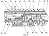 Каждый туннель имеет два обжатых на породу свода – верхний 29 и обратный 30 (фиг.2), которые набраны из железобетонных тюбингов. Облицовка туннеля по всей длине энергоблока 1 усилена в верхней части металлическими полуобечайками 31 со шпангоутами для размещения подъемно-транспортного оборудования. Принцип действия подземной атомной электростанции состоит в том, что вырабатываемая атомной реакторной установкой 19 тепловая энергия отбирается рабочим телом – пароводяной смесью во втором контуре охлаждения и переводится в механическую энергию струи пара, которая по паропроводу 28 подается на турбогенераторную установку 21, преобразующую механическую энергию струи пара в электрическую. Существенным для рассматриваемого процесса является то, что при соответствующем выборе параметров термодинамического цикла достигается превышение давления нерадиактивного пароводяного рабочего тела во втором контуре над давлением радиоактивного жидкометаллического теплоносителя в первом контуре охлаждения реакторной установки 19, что обеспечивает градиент давления среды в направлении к первому контуру в случае нарушения целостности контуров и возникновения аварийной ситуации, при этом градиент давления обеспечивает локализацию радиоактивных веществ внутри первого контура (активная защита). Подобная реакторная установка широко используется, в частности, на судах в качестве источника электроэнергии. Посредством кабельных трасс 4 вырабатываемая электроэнергия передается на трансформаторную подстанцию наземного вспомогательного комплекса сооружений 15 для распределения потребителям.