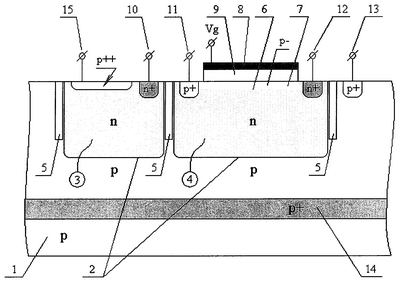 В ток, соответствующий красной составляющей от светового потока, падающего на поверхность подложки, вносит вклад и инфракрасная составляющая. Это приводит к ошибкам распознавания спектрального состава потока в известных фотоячейках. Кроме того, независимо от светового потока, падающего на поверхность подложки, в глубине подложки генерируются электронно-дырочные пары, обусловленные шумами. Эти носители заряда в известных фотоприемных ячейках могут достигать р-n-переходов и вносить определенный вклад в токи, по величинам которых определяются доли излучений в падающем световом потоке, соответствующие синему, зеленому, и красному поддиапазонам оптического спектра. Таким образом, возникают ошибки цветоразделения в известных ячейках-аналогах и прототипе. В фотоприемной ячейке с разделением цветов согласно настоящему изобретению дополнительная область 14 противоположного подложке типа проводимости, формирующая потенциальный барьер, блокирует продвижение неосновных носителей заряда, генерированных в области подложки, расположенной глубже барьера, к р-n-переходам. Дополнительная область 14, например, может быть расположена на глубине, равной 1,45 мкм. В результате, в значительной мере ослабляется влияние шумов на результаты цветоразделения. Блокирование носителей заряда, генерированных в областях подложки, расположенных вокруг ячейки, осуществляется посредством диэлектрической изоляции 5. Эта конструктивная деталь вносит дополнительный вклад в эффективность цветоразделения.