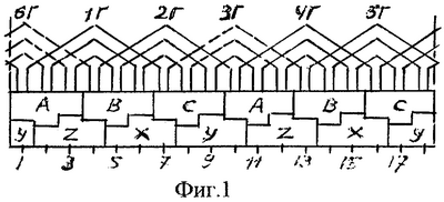 На фиг.1 показаны развертки пазовых слоев предлагаемой обмотки по первому варианту при 2р=4 (с=1), z=18 пазах с номерами 1…18, 6с=6 катушечных группах с номерами 1Г…6Г с их верхними лобовыми частями, чередованиями фазных зон в последовательности А-В-С верхнего и X, Y, Z нижнего слоев, а на фиг.2 построены (по треугольной сетке) ее многоугольники МДС при катушках равно- (внутренний) и неравновитковых (наружный) для х=0,5; на фиг.3, 4 – то же, что и на фиг.1, 2, но для второго варианта. При с=2, 3,… обмотка имеет 2р=4с=8, 12,… полюсов, z=18c=36, 54,… и повторе 2, 3,… раза развертки фиг.1, 3. Предлагаемая m’=3-зонная обмотка соединяется в фазах обычным образом при согласном последовательном (a=1) или параллельном (a=2) включении групп фазы: 1Г, 4Г с началом фазы из начала 1Г в фазе I; 2Г, 5Г с началом из 2Г в фазе II; 3Г, 6Г с началом из 3Г в фазе III, а фазы могут сопрягаться в звезду (Y) или треугольник ( ).