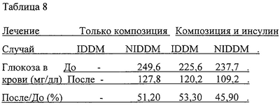 Как следует из результатов, приведенных в таблицах 4-6, подтверждается что композиции настоящего изобретения обладают противоопухолевой активностью in vivo, т.е. в организме человека. Иными словами, получены благоприятные результаты лечения в случае цервикальной карциномы, карциномы легких, рака яичников, рака молочной железы (метастаз), рака кожи (метастаз), рака молочной железы и рака кожи. Пример 6. Клинические испытания на больных диабетом Основной раствор получали согласно примеру 1. Кроме того, женьшень японский измельчали на кусочки размером примерно 5 мм. Добавляли 500 мас. частей 40% раствора этилового спирта к 10-20 мас. частям полученных кусочков, осуществляли тепловую экстракцию, нагревая раствор до 80-100°С до тех пор, пока спирт почти полностью не испарялся, и получали экстракционный раствор женьшеня японского. Основной раствор композиции примера 1 и экстракционный раствор женьшеня японского смешивали в соотношении 2:1. Полученный раствор вводили ежедневно 25 больным (11 мужчинам и 14 женщинам) сахарным диабетом в дозах по 150 мл 2 раза в течение 25 дней. Было обнаружено, что все пациенты, кому вводили композицию, или сообщали, или у них находили ослабление боли, особенно значительные улучшения наблюдались в отношении головной боли и онемения конечностей, улучшение аппетита, восстановление зрения, снижение стресса и улучшение сна. Также наблюдали смягчение осложнений и излечение. У некоторых пациентов даже возвращалась чувствительность в некротических нижних конечностях. Клинические результаты приведены в табл.7. Как видно из табл.7, подтверждается снижение уровня глюкозы в крови у всех пациентов после такого клинического введения. Введение указанной композиции не вызывало какие-либо отрицательные действия. Кроме субъективного улучшения симптомов, также было обнаружено заметное гипогликемическое действие.