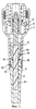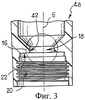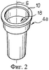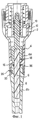 Нижняя часть 4b наконечника имеет на верхнем конце участок меньшего диаметра, чем остальной участок этой части. Указанный участок имеет наружную резьбу 26, подходящую для винтового взаимодействия с внутренней резьбой 20 верхней части 4а. Верхний конец нижней части 4b образован плоской поверхностью 20, перпендикулярной оси 6 и примыкающей к поверхности 22 другой части 4а, когда эти два элемента свинчены вместе, вследствие чего задается их точное относительное положение при взаимном соединении. Эта поверхность 28 расположена с отступом от той части, которая граничит с каналом 18, с образованием выступа 30, представляющего цилиндрическую поверхность 32, проходящую вокруг оси 6 и обращенную к каналу 18, и плоской нижней поверхности 34, перпендикулярной оси 6.
