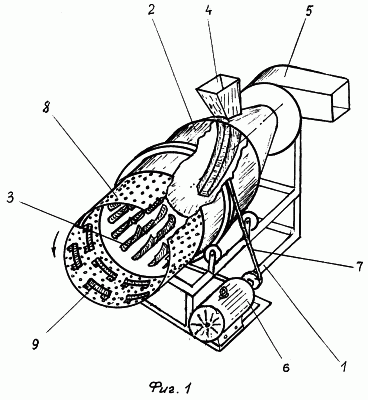 Ворох подают через загрузочное устройство 4 внутрь вращающегося цилиндра 2, где, захватываясь лопатками 3, он многократно поднимается вверх и рассеивается по сечению цилиндра 2. Воздушный поток, создаваемый вентилятором 5, продувает падающий ворох и уносит легкие примеси. Семена и тяжелые примеси, многократно ссыпаясь с лопаток 3, выходят из цилиндра 2 в цилиндрическое решето 8 вследствие их наклона. В цилиндрическом решете 8 происходит отделение тяжелых крупных примесей от семян основной культуры. Ограничителями 9 сепарируемая масса задерживается для того, чтобы семена успели просыпаться сквозь отверстия решета 8, вращающегося вместе с цилиндром 2. Тяжелые крупные примеси, многократно перемешиваясь, выбрасываются наружу через выходное отверстие решета 8.