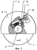 Насадка к электроприводу в ее третьем варианте (фиг.7,8) содержит пильный диск 1 с помощью втулки 4 (фиг.8) и фланца 5, закрепленный на резьбовой части вала 3 вращения, размещенный внутри защитного кожуха 9, выполненного с фасонной проточкой 23, прикрепленного к корпусу 2, с противоположной стороны которого закреплен фрагмент диска 24, выполненный с такой же фасонной проточкой 23, при этом внутри фасонных проточек 23 размещена, по меньшей мере, одна пара фрагментов фасонных колец 25 с возможностью их перемещения по проточкам 23 и фиксации их места положения при помощи винтов 26. Плита 15, выполненная съемной, на фиг.7, 8 не показана. На фиг.8 показаны разметки 27 со шкалами. На фиг.7, 8 – ролики 28. На фиг.7 – заготовка 29.