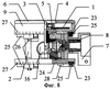 В примере конкретной реализации по всем вариантам технического решения в насадке к электроприводу ручка 16 может иметь другое крепление, например, к плите 15 (плита 15 показана только на фиг.6). В насадках к электроприводу 11, не имеющему рукояти 17, используется рукоять 17 насадки с креплением к плите 15 или электроприводу 11 или с креплением и к электроприводу 11, и к плите 15. При необходимости в рукояти 17 можно разместить клавишу 19 включения электропривода 11, кнопку 20 фиксации клавиши 19, регулятор 21 частоты вращения вала 3 с электронной схемой с подключением к электроприводу 11 и токопроводящему шнуру 22 со штепсельной вилкой для подключения к сетевой розетке. Защитный кожух 9 (корпус 2 фиг.1) может быть выполнен с патрубком для подключения пылесоса (на чертежах не показано).