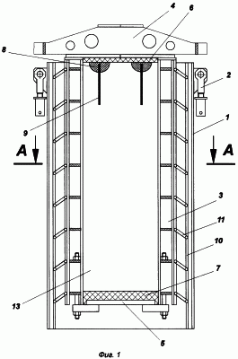 Внутреннее пространство опалубки 3 образует полость 13 для размещения в ней бетонной смеси и формования изделий. Причем на боковой поверхности опалубки 3 установлены эластичные вкладыши 14.