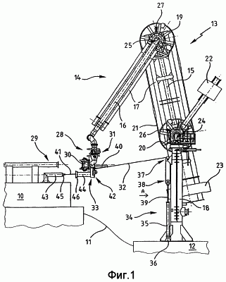 Таким образом, чем ближе находится загрузочный манипулятор 14 к патрубку 29, тем лучше он следует движениям судна 10, как показано на фиг.5. Окончательное выравнивание осуществляется до того как гидравлическая муфта 30 достигнет фланца патрубка 29.