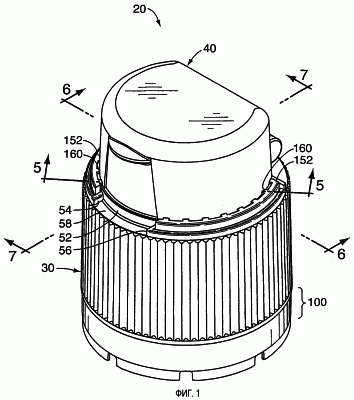Предпочтительный, в данном случае, вариант выполнения дозирующей конструкции или дозирующей укупорочной системы, соответствующей настоящему изобретению, показан на фиг.1-10 и обозначен на фиг.1 ссылочной позицией 20. В показанном предпочтительном варианте осуществления изобретения дозирующая конструкция или дозирующая укупорочная система 20 выполнена в форме отдельного укупорочного средства 20, которое приспособлено для установки на контейнер 22 (фиг.5), который, в обычном случае, может содержать текучий материал. Контейнер 22 включает корпус 24 и горлышко 26, как показано на фиг.5. Горлышко 26 образует отверстие 28, сообщающееся с внутренним пространством контейнера. Горлышко 26 контейнера в предпочтительном варианте осуществления изобретения, показанном на фиг.5, имеет внешнюю охватываемую резьбу 29 для вхождения в зацепление с укупорочным средством 20.