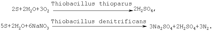 Предлагаемое изобретение относится к области энергетики, в частности к способам нейтрализации щелочной воды серной кислотой и способов обработки воды замкнутой системы оборотного водоснабжения или подготовки добавочной воды для подпитки системы оборотного водоснабжения и способов очистки воды с использованием биохимического процесса окисления, основанного на использовании микроорганизмов (бактерий) рода Thiobacillus. Предлагаемое изобретение может быть использовано в системах оборотного водоснабжения, для очистки промышленных или сточных вод, которые нуждаются в осветлении и/или подкислении воды до нормативно необходимых величин. Известен способ очистки воды от сероводорода в реакторе биохимического окисления путем пропускания исходной воды и воздуха через затопленную зернистую загрузку щебня или гравия. В результате через 1-2 недели на загрузке развиваются тионовые бактерии Thiobacillus thioparus, которые окисляют сероводород до серы и сульфатов. В случае необходимости интенсификации развития тионовых бактерий в исходную воду перед реактором биохимического окисления вводят раствор триполифосфата натрия. (1). Известен также способ очистки промышленных сточных вод от сульфидов путем их бактериального окисления, канализуемого микроорганизмами Thiobacillus ferroxidans (2). Действие бактерий Thiobacillus thioparus или Thiobacillus ferroxidans в известных способах основано на их способности окислять до серы и сульфатов сероводород или сульфиды, которые содержатся в воде. Известные способы обеспечивают снижение содержания в воде сероводорода, сульфидов и железа двохвалентного. Недостатком известных способов 1,2 является то, что они могут быть использованы только при наличии в воде свободного сероводорода или сульфидов, а рН исходной воды должно быть не более 7-9. Наиболее близким по технической сущности и достигаемому результату к предлагаемому способу является способ нейтрализации щелочной воды путем ее подкисления серной кислотой (3). Для подкисления используют серную кислоту, которую подают дозатором, и подкисление воды осуществляют с целью снижения общей щелочности и рН воды. Недостатком способа является химическая и экологическая опасность процесса нейтрализации, обусловленная необходимостью использования химически агрессивной и экологически опасной серной кислоты. В основу изобретения поставлена задача усовершенствования способа нейтрализации воды, в котором путем изменения условий известного способа, в частности использования новых, самих по себе известных веществ, обеспечивается возможность повышения химической и экологической безопасности процесса нейтрализации воды. Эта задача решается тем, что в известном способе нейтрализации щелочной воды путем ее подкисления серной кислотой согласно предлагаемому изобретению серную кислоту получают непосредственно в процессе подкисления, путем контактирования исходной воды с гранулированной серой с размером гранул от 1 до 5 мм в присутствии бактерий Thiobacillus thioparus и/или Thiobacillus denitrificans, степень подкисления воды регулируют подачей воздуха в таком количестве, которое обеспечивает снижение щелочности до нормативно необходимой величины от 0,5 до 6,5 мг·экв/л и процесс осуществляют при температуре 4-60°С и линейной скорости подачи воды 2-12 м/час. Технический результат предлагаемого изобретения зак