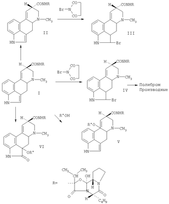 Реакция бромирования эргоалкалоидов протекает неоднозначно в связи с высокой химической лабильностью молекул этих природных соединений (I) и сопровождается рядом побочных превращений (см. схему).