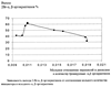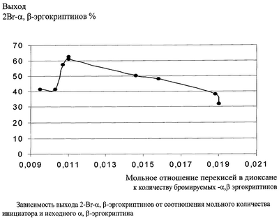Бромирование является реакцией радикального типа и в связи с этим требует наличия в реакционной среде инициаторов, таких как гидроперикиси. Этим обусловлена необходимость присутствия в среде реакции диоксана, содержащего определенное количество гидроперекисей. Считается, что концентрация гидроперекисей порядка 0,01% достаточна для проведения этой реакции. Учитывая вышеописанное, нами предлагается способ проведения реакции бромирования и -эргокриптиновых алкалоидов в контролируемых по содержанию перекисей условиях. При осуществлении реакции бромирования в промышленных масштабах (на порядок большие промышленные загрузки, чем лабораторные), нами было установление, что выход реакции тем выше, чем ближе содержание перекисей в диоксане к оптимальному по отношению к количеству исходного вещества в реакционной среде (см. таблицу). Оптимум мольного отношения инициатора к бромируемому веществу был найден при проведении серии загрузок в условиях реального производства. Оказалось (см. чертеж), что зависимость выхода 2-бром- , -эргокриптинов от этого параметра имеет колоколообразную форму. При низких значениях до 0,010 в реакционной массе остается исходное соединение и выход целевого вещества невысок. Он также снижается при избытке перекисей, когда мольное соотношение превышает 0,015, за счет протекания побочных превращений, типа полибромпризводных и люмипродуктов. Было показано, что выгодно использовать более концентрированные растворы исходного вещества в пределах от 0,125 до 0,150 м/л , -эргокриптинов при сохранении соотношения хлороформ – диоксан в среде реакции 10:1 вместо описанных концентраций порядка 0,1 М/л. При этом снижаются расходные нормы по абсолютным высокоочищенным растворителям и увеличивается производительность за счет увеличения единичных загрузок в 16 раз по сравнению с прототипом. Верхний предел в 0,15 М/л ограничивается растворимостью всех компонентов в реакционной смеси и нормами механических потерь при последующей обработке высококонцентрированных растворов.