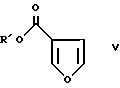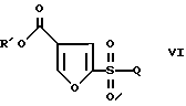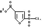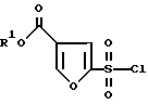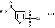 Пример IЭтил-2-(хлорсульфонил)-4-фуроат В четырехгорлую колбу на один литр с механической мешалкой и атмосферой азота помещают этил 3-фуроат (50 г, 0,357 моля) и метиленхлорид (500 мл). Колбу охлаждают до -10oC и по каплям за 5 мин добавляют хлорсульфоновую кислоту (24,92 мл, 0,375 моля). Температуру повышают до -6oC. Удаляют охлаждающую баню и реакционную смесь оставляют медленно нагреваться до комнатной температуры. Реакционную смесь перемешивают в течение 72 ч, при этом она состоит из зеленого раствора и белой твердой суспензии. Охлаждают до -10oC и добавляют по каплям пиридин (31,7 мл, 0,393 моля). Это вызывает экзотермическую реакцию, которую регулируют скоростью добавления, поддерживая температуру ниже 0oC. После добавления реакционная смесь представляет густую суспензию. После охлаждения до -8oC добавляют пентахлорид фосфора (PCl5) (81,74 г, 0,393 моля) порциями по 15 г в течение 10 мин. После перемешивания в течение 30 мин холодной смеси баню удаляют и реакцию оставляют нагреваться до комнатной температуры. Смесь перемешивают в течение ночи. Реакционную смесь переносят в капельную воронку и добавляют по каплям воду (1 л) с перемешиванием при комнатной температуре. Во время добавления температура увеличивается до 38oC вследствие гидролиза (POCl3). Добавление занимает 1,5 ч, и смесь перемешивают в течение 45 мин для гарантии завершения гидролиза. Разделяют слои и экстрагируют водный слой метиленхлоридом (75 мл). Объединенные органические слои промывают водой и сушат над сульфатом натрия. Раствор фильтруют и выпаривают в вакууме, получая сульфонилхлорид в виде масла 67,8 г, 80% выход. Это подходит для использования, как есть, в следующей реакции. 1H ЯМР этил 2-(хлорсульфонил)-4-фуроата (CDCl3, 400 МГц) : 8,21 (с, 1), 7,59 (с, 1), 4,35 (кв, 2), 1,36 (т, 3); 13C ЯМР (CDCl3 400 МГц) : 160,5, 151,4, 150,7, 121,6, 118,1, 61,7, 14,2.