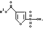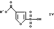 Пример IIЭтил 4-фуроат-2-сульфоновая кислота. Этил 3-фуроат (13,5 мл, 0,1 моля) растворяют в метиленхлориде (150 мл) и перемешивают под азотом при охлаждении до -10oC. Добавляют по каплям за 15 мин хлорсульфоновую кислоту (8,3 мл, 0,125 моля) в метиленхлориде (25 мл). Реакцию нагревают до комнатной температуры и перемешивают в течение ночи. Осажденное белое твердое вещество собирают под азотом и промывают свежим метиленхлоридом. Быстро переносят его в круглодонную колбу (вещество гигроскопично) и сушат в высоком вакууме. Выход гигроскопичного белого твердого вещества составляет 14,1 г, 64%. Когда это вещество растворяют в этилацетате и сушат над сульфатом натрия, выделяется соль натрия в виде белого твердого вещества, т.пл. 220oC (спекается), 245-248oC (разл.). ИК (смещения) 3507, 3459, 3155, 3127, 1731, 1712, 1262, 1231, 1205 см-1. 1H ЯМР (D2O, 300 МГц) : 8,19 (с, 1), 7,10 (с, 1), 4,27 (кв, 2), 1,30 (т, 3). 13C ЯМР (D2O, 300 МГц) : 164,4, 152,9, 149,8, 119,6, 110,5, 62,2, 13,4.