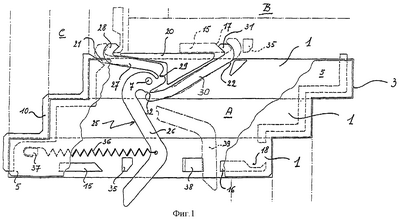 Рычаг 26, относящийся к паркетной детали А, находится в первом положении: показано прерывистой линией на Фиг.1. Он удерживается в нем наклонным краем элемента 38 несмотря на усилие пружины 36.