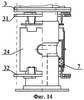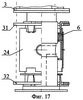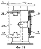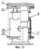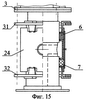 В варианте, показанном на фиг.10-11, уплотнения жидкостной полости включают сальниковую набивку 6 и 7, к которой со стороны жидкостной полости примыкают упорные кольца 22 и 23, а со стороны торцов корпуса вертлюга 24 – внутренние нажимные кольца 25. Между упорными кольцами 22 и 23 размещена дистанционная втулка 26, в которой выполнено отверстие для прохода бетонной смеси или буровых растворов от патрубка 27 в жидкостную полость 28. Во втулке 26 имеется также продольный направляющий паз 29, а в корпусе 24 – винт 30, обеспечивающие подвижность втулки 26 только в продольном направлении. Упорные кольца 22, 23 и дистанционная втулка 26 могут быть выполнены в виде одной детали, как показано на фиг.10, или в виде отдельных деталей с крепежным соединением между ними или без такого соединения. На шпильках 15 закреплены внешние нажимные кольца 31 и 32 с Г-образными перемычками 33. Внутренний диаметр колец 31 и 32 больше диаметра корпуса 24. В корпусе 24 выполнены открытые с торцов прорези 34, ширина которых превышает ширину перемычек 33. В этом примере кольца 25, 31, 32 и Г-образные перемычки 33 выполняют функцию нажимных втулок.