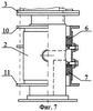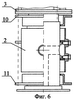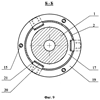 В вертлюге, показанном на фиг.8-9, каждая нажимная втулка выполнена сборной из отдельных деталей – двух колец, внутреннего и внешнего, и нескольких перемычек между ними (соединение этих деталей может быть как разъемным, так и неразъемным). К сальниковой набивке 6 и 7 со стороны торцов корпуса 2 примыкают внутренние нажимные кольца 17. На шпильках 15 закреплены внешние нажимные кольца 18 и 19 с Г-образными перемычками 20. Внутренний диаметр колец 18 и 19 больше диаметра корпуса 2. В корпусе 2 выполнены открытые с торцов прорези 21, ширина которых превышает ширину перемычек 20.