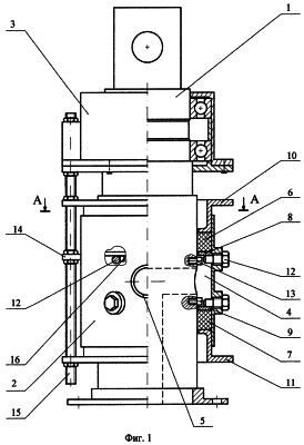 Вертлюг (фиг.1, 2) содержит вал 1, корпус вертлюга 2 и корпус подшипникового узла 3. В этом и последующих примерах предусматривается фланцевое присоединение шнека к валу вертлюга. Для подачи бетонной смеси или буровых растворов в средней части вертлюга образована жидкостная полость 4, в корпусе выполнен патрубок 5 для присоединения нагнетательного трубопровода, а вал имеет соединенные между собой поперечное и продольное отверстия. Уплотнения жидкостной полости включают сальниковую набивку 6 и 7, к которой со стороны жидкостной полости примыкают упорные кольца 8 и 9, а со стороны торцов корпуса вертлюга – нажимные втулки 10 и 11. С упорными кольцами 8 и 9 сопряжены винты 12 в корпусе вертлюга, а на валу установлены винты 13, причем в рабочем (собранном) состоянии вертлюга между кольцами 8 и 9 и соответствующими винтами 13 имеется зазор. Корпус вертлюга через проушины 14 соединен шпильками 15 с корпусом подшипникового узла 3. На этих же шпильках 15 закреплены нажимные втулки 10 и 11. При малом радиальном зазоре между валом и упорными кольцами 8 и 9 на этих кольцах для предотвращения их поворота могут быть установлены штифты 16.