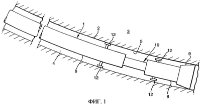 На фиг.1 показана бурильная колонна 1, проходящая в скважине 2, образованной в подземном пласте 3, с кольцевым зазором 4 между бурильной колонной и стенкой 5 скважины. Бурильная колонна имеет верхнюю часть 6 и нижнюю часть 8, снабженную бурильным долотом 9, при этом части 6, 8 взаимосвязаны с помощью телескопического гидравлического толкателя 10, способного толкать нижнюю часть 8 бурильной колонны в направлении устья скважины. Верхняя часть 6 бурильной колонны и нижняя часть 8 бурильной колонны снабжены соответствующими группами закрепляющих элементов 12 (например, три) в виде башмаков, расположенных по окружности бурильной колонны с одинаковым интервалом. Каждый башмак 12 соединен с соответствующей частью 6, 8 бурильной колонны таким образом, что башмак 12 может перемещаться между втянутым положением, в котором башмак 12 втянут от стенки 5 скважины, и выдвинутым положением, в котором башмак 12 выдвинут к стенке 5 скважины так, чтобы закреплять соответствующую часть 6, 8 бурильной колонны на стенке 5 скважины. Бурильная колонна внутри снабжена системой управления (схематически показана на фиг.2) для управления перемещением каждого башмака 12 между его втянутым положением и выдвинутым положением.