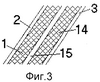 Вариант 2. Выполнение ЭДЗ согласно варианту 2 обеспечивает возможность варьирования скоростью метания стенок контейнера и, тем самым, позволяет дополнительно изменять уровень взрывного воздействия на защищаемый объект. Так при попадании в показанный на иллюстрации фиг.3 элемент динамической защиты, кумулятивной струи, образованной лидирующим кумулятивным зарядом 4 боеприпаса тандемного типа, аналогично варианту 1, в локальной области, где осуществляется воздействие, в слоях взрывчатого вещества 1 и 14 будут образовываться ударные волны, давление в которых превосходит давление, осуществляющее инициирование детонации. При этом во взрывчатом веществе каждого слоя происходит процесс выделения энергии, который приводит к метанию слоев 2 и 3, в направлениях, близких к нормали к поверхности ЭДЗ со скоростями большими, чем обеспечивает вариант 1, так как по сравнению с ним энергии взрывчатого превращения выделяется в два раза больше. Инертные слои ЭДЗ 2 и 3 взаимодействуют с высокоскоростными участками КС лидирующего заряда 4. При этом процесс взаимодействия протекает более интенсивно, в связи с чем разрушается большая часть кумулятивной струи лидирующего заряда 4. При этом наличие между слоями ВВ 1 и 14 слоя из инертного в химическом отношении материала 15 обеспечивает раздельное протекание в указанных слоях взрывного процесса, что (аналогично варианту 1) препятствует развитию процесса детонации вне области, где давление ударных волн 9, созданных действием кумулятивной струи лидирующего заряда 4, выше давления необходимого для инициирования детонации.