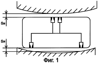 На Фиг.1 изображено положение детали, когда плоскость расположения сопел находится в плоскости максимального изгиба отверстия, при этом центральные сопла повернуты к выпуклой поверхности отверстия, суммарная величина зазоров S1 минимальна. Если условно представить, что измерительная пробка 2 расположена идеально по оси отверстия, то S1=4Sи, где Sи – измерительный зазор каждого отдельного сопла.