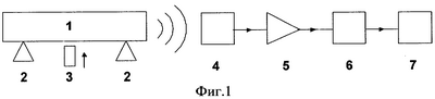 В твердом теле 1 (в вагонной оси) посредством ударного воздействия ударником 3 возбуждают упругие колебания на собственных частотах, измеряют колебательный отклик микрофоном 4, сигнал которого усиливается усилителем 5, преобразуется в цифровой сигнал с помощью АЦП 6 и записывается в компьютер 7 в виде дискретных равноотстоящих отсчетов. В зарегистрированной временной реализации отклика выделяется начало удара, и с этого момента временная реализация разбивается на последовательные N отрезков по М отсчетов каждый. unm – последовательные дискретные значения амплитуд измеряемого сигнала u(t), где n – порядковый номер отрезка, a m – номер отсчета в n-ом отрезке. От каждой из N временных реализаций (отрезков) принимаемого сигнала вычисляется преобразование Фурье и в полученном спектре определяется максимальная амплитуда волны fn max на одной из k собственных частот в данный момент времени (фиг.2 и 3). К – число собственных частот.