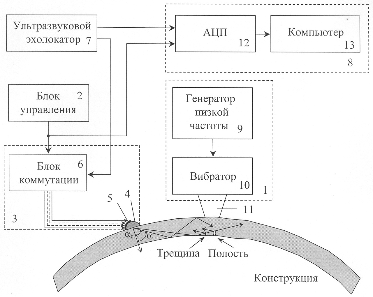 Разработанный способ реализуют следующим образом (см. фиг.1). Акустическую призму 4, с размещенной на ней матрицей из n ультразвуковых преобразователей 5, устанавливают на поверхности конструкции (показано ее сечение), а матрицу ультразвуковых преобразователей 5 подключают к блоку коммутации 6. По сигналу начальной установки с блока управления 2 посредством блока коммутации 6 подключают m первых ультразвуковых преобразователей (от По до Пm) матрицы ультразвуковых преобразователей 5 к ультразвуковому эхолокатору 7. Этим устанавливают минимально необходимый угол ввода 0 ультразвуковой волны. При этом импульсный сигнал с ультразвукового эхолокатора 7 направляют на m ультразвуковых преобразователей 5 матрицы и излучают в конструкцию ультразвуковую волну с углом ввода 0. Ультразвуковую волну, отраженную от внутренних дефектов конструкции (трещины, полости), принимают этими же ультразвуковьми преобразователями 5. Принятый сигнал с выхода ультразвукового эхолокатора 7 направляют в блок обработки информации 8. В блоке обработке информации 8 принятый сигнал проходит через плату аналого-цифрового преобразователя 12, преобразующего аналоговый сигнал в цифровой код с определенной частотой дискретизации, который далее записывается в компьютер 13. Одновременно с введением ультразвуковой волны в конструкции возбуждают низкочастотную вибрацию с помощью блока возбуждения низкочастотных колебаний 1. Для этого сигнал установленной резонансной частоты 0 с генератора низкой частоты 9 подают на вибратор 10, передающий свои колебания конструкции через сопрягающий элемент 11. При наличии в конструкции трещин акустические характеристики трещин изменяются под действием возбужденных колебаний с частотой 0, при этом распространяющаяся в конструкции ультразвуковая волна модулируется на трещине этими колебаниями частоты 0. Сигнал принятой ультразвуковой волны обрабатывают с целью обнаружения в нем модуляции на частоте 0 для различных дальностей локации dp, где dp изменяется от нулевого значения до максимального значения дальности dmax, с шагом, определяемым скоростью ультразвуковой волны в конструкции, частотой дискретизации платы АЦП 12 и углом ввода 0 ультразвуковой волны. Вычисленную для угла ввода 0 амплитуду модуляции A0(dp, 0> 0) для каждой дальности локации dр регистрируют. Далее по сигналу с блока управления 2 к ультразвуковому эхолокатору 7 подключают следующие m преобразователей (от П1 до Пm+1), изменяя этим угол ввода на 1. Для этого угла ввода 1 также определяют и регистрируют амплитуду модуляции A1(dp, 0, 1) для каждой дальности локации. Операцию повторяют до тех пор, пока не будут установлены все возможные углы ввода i от 0 до n и зарегистрированы все амплитуды модуляции Ai(dp, 0, i), то есть сформирован диапазон исследуемых дальностей. Затем измерения повторяют, по крайне мере, еще для одного значения частоты 1 и определяют для нее изменение модуляции сигнала ультразвуковой волны A(dp, i, i). Из полученных распределений для каждого угла ввода i выбирают и регистрируют для каждой дальности локации только максимальные значения амплитуд модуляции ультразвуковой волны A(dp, i). В первом приближении амплитуда модуляции пропорциональна геометрическим размерам трещины. По превышению установленным распределением A(dp, i) для всех дальностей порогового уровня, опре