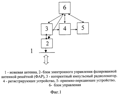 Один из вариантов устройства для реализации разработанного способа, представленный на фиг.1, содержит антенну 1, выполненную в виде фазированной антенной решетки с ножевой вращающейся диаграммой направленности. Антенна 1 через блок 2 электронного управления вращением диаграммы направленности соединена с импульсным доплеровским радиолокатором 3 сантиметрового диапазона, который в свою очередь соединен с регистрирующим устройством 4, выход которого соединен со входом приемопередатчика 5, обеспечивающего связь со станцией слежения (на чертеже не показана) на Земле. При этом управление всеми элементами устройства для реализации разработанного способа осуществляется с помощью блока управления 6, который имеет соединение с блоком 2 электронного управления, с радиолокатором 3, регистрирующим устройством 4 и приемопередатчиком 5.