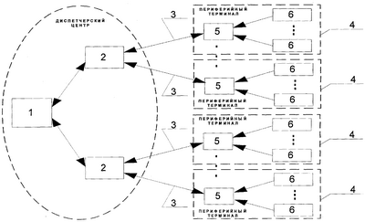 ЦМК 2 через каналы электросвязи 3 соединен по меньшей мере с одним периферийным терминалом 4. Электросвязь может осуществляться по выделенным физическим парам прямых проводов на расстояние до 15 км от периферийного терминала до диспетчерского центра либо через выделенные каналы тональной частоты (ТЧ) любых систем передачи. Также каналами электросвязи могут служить коммутируемые телефонные каналы ГТС, при этом в системе используют выделенные телефонные номера, постоянная коммутация которых программно прописана в памяти цифровых АТС.