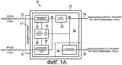 На фиг.1А показана блок-схема силового преобразователя 10 с двумя входами (по переменному/постоянному току), имеющего два программируемых выходных напряжения постоянного тока, согласно настоящему изобретению. Силовой преобразователь 10 в предпочтительном варианте содержит схему 20 силового преобразователя, включающую в себя преобразователь 22 переменного тока в постоянный, повышающий преобразователь 24 постоянного тока, схему 26 обратной связи, схему 25 фильтра и понижающий преобразователь 28 постоянного тока.