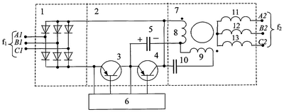 Трехфазное напряжение источника электроэнергии повышенной частоты f1 поступает на входные выводы преобразователя A1, B1 и С1 соответственно (фиг.1). Выпрямителем 1 напряжение переменного тока преобразуется в напряжение постоянного тока, которое затем поступает на вход инвертора 2.